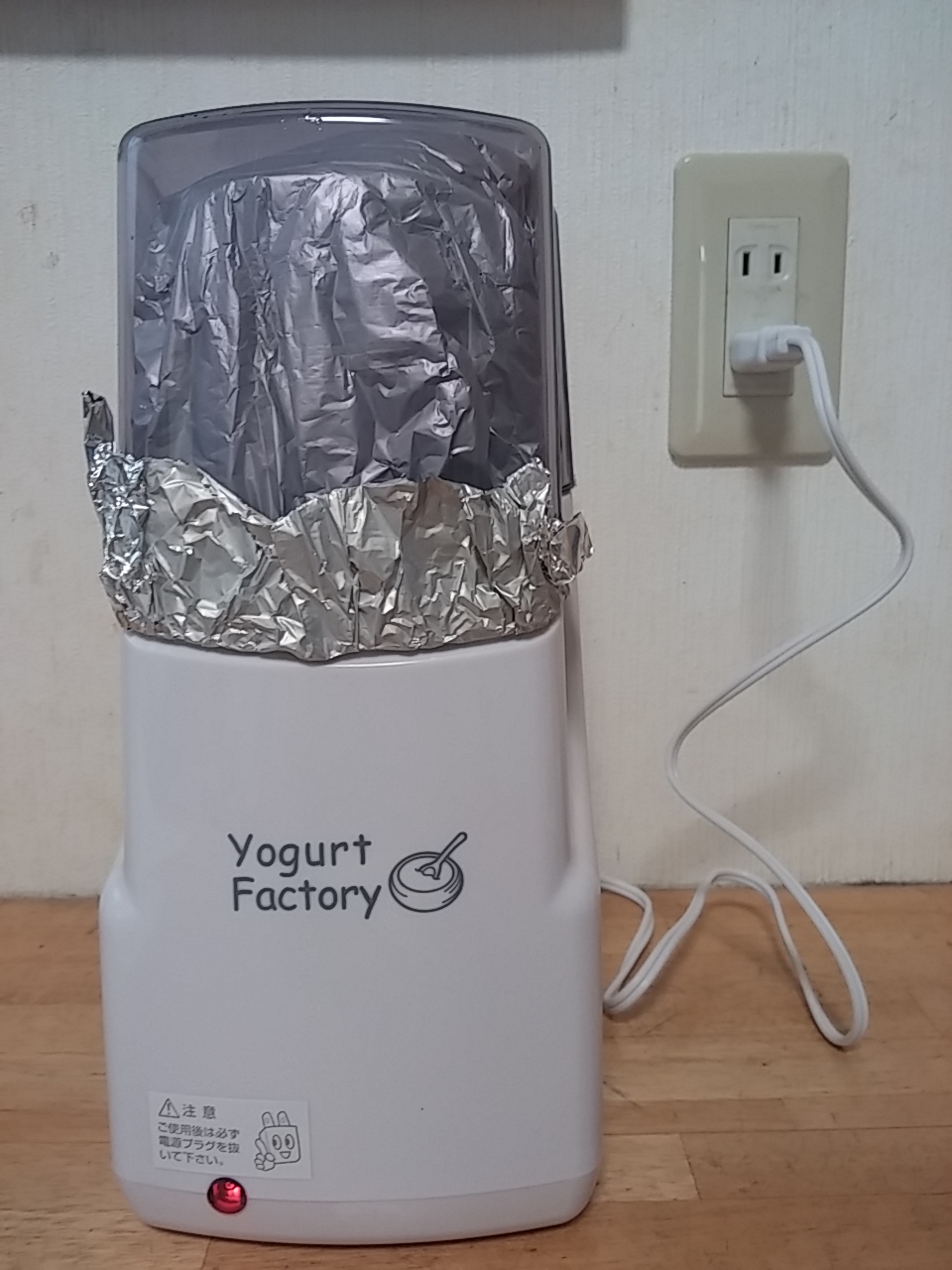 最後に、フタを本体にしっかりと乗せて、電源プラグをコンセントに挿すと本体下側の赤いランプが点灯し、保温が始まって乳酸菌がお仕事をするのをじっと10時間くらい待つ。
